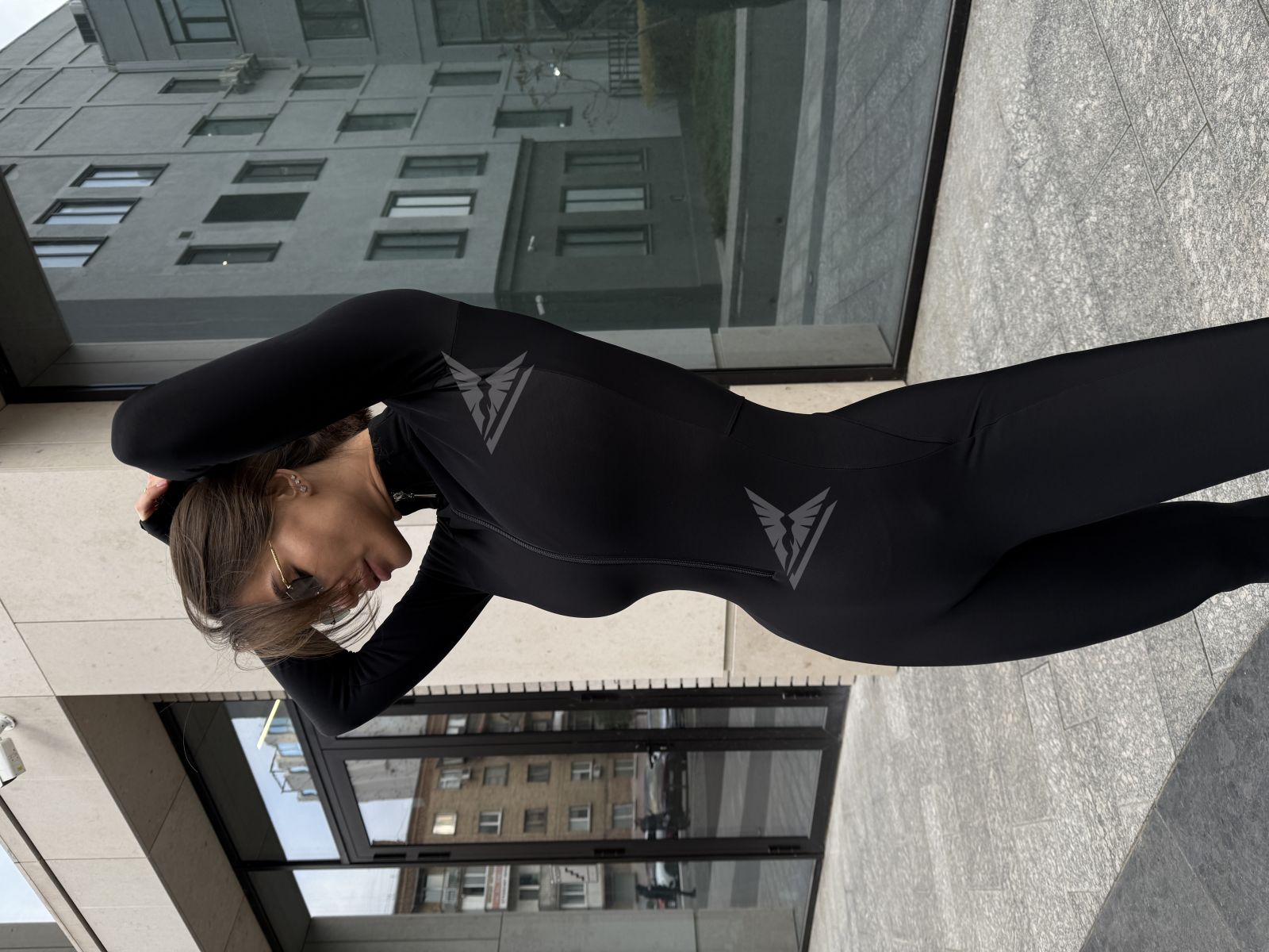 Функціональна застібка-блискавка спереду дозволяє носити комбінезон як зі скромнішим горлом, так і з більш відкритим вирізом. Подовжені рукави з отвором під великий палець фіксуються на руці, не задираються та додають образу динаміки. Модель підходить для прогулянок, поїздок, повсякденних луків і легких тренувань, легко поєднується з верхнім одягом, пуховиками, пальто чи куртками.